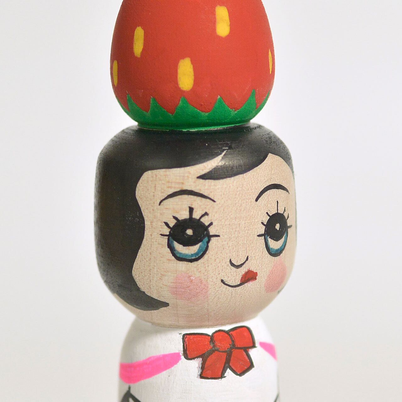 北山真由美工人作のおいしそうなイチゴを乗せたカワイイ「いちご乗せこけし」。